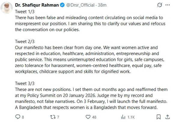 পোস্টে ডা. শফিকুর রহমান বলেন, কিছু মিথ্যা ও বিভ্রান্তিকর তথ্য সামাজিক যোগাযোগমাধ্যমে ছড়িয়ে পড়েছে, যা তার অবস্থান ভুলভাবে উপস্থাপন করছে। তিনি স্পষ্ট করেছেন, দলের নির্বাচনী ইশতেহার প্রথম দিন থেকেই পরিষ্কার। নারীর ক্ষমতায়ন ও সম্মান নিশ্চিত করা তার দলের মূল নীতি ও উদ্দেশ্য।